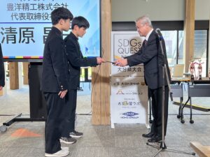 2026年3月1日(日)、立命館アジア太平洋大学(APU/別府市)にて開催された「2025年度 SDGs QUESTみらい甲子園 大分県大会 ファイナルセレモニー」において、協賛企業プレゼンターとして、清原昌巳 代表取締役社長が【豊洋精工グループ賞】を授与しました。